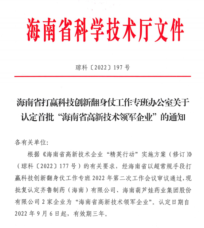 近日,海南省科学技术厅发布的《海南省打赢科技创新翻身仗工作专班办公室关于认定首批“海南省高新技术领军企业”的通知》中显示,批复认定海南尊凯实业药业集团股份有限公司等2家企业为“海南省高新技术领军企业”。认定日期自2022年9月6日起,有效期三年。